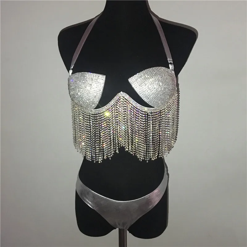 SALE Silver Bling Rhinestone Swimsuit Tassel Underwire Bra Push Up Bandage Bikini Set Sexy Ladies Skinny